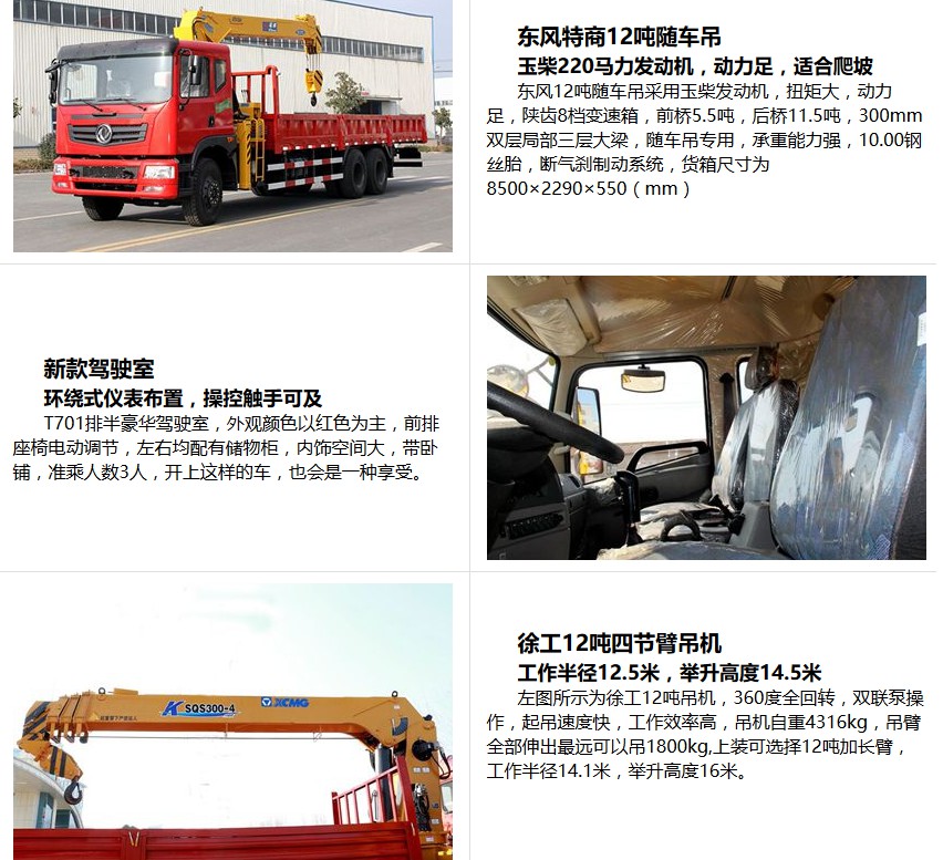 随底盘选装驾驶室.选装箱板结构,选装上/中座椅操作,可选装直臂式或折臂式吊机,直臂式吊机:型号/吊机质量(kg)/最大起升载荷(kg)/载质量分别为:(QYS-10III,SQS-10III,URV1004,SPS25000,KS2305,nicoleV1004)/4000/6000/8520(2人),8455(3人);(QYS-12IV,SQS-12IV,URV1200,SPS30000,nicoleV1200)/4500/7000/9900(2人),9835(3人);.折臂吊机的分别为:(SQ10Z,QYS-10Z)/4000/6000/8520(2人),8455(3人);SQZ-12III/4500/7000/9900(2人),9835(3人);外形尺寸/轴距/前悬/后悬对应关系分别为:10050/4350 1300/1250/ 3150(1450/2950),10550/4750 1300/1250/3250(1450/3050),11350/5350 1350/1250/3400(1450/3200),11930/5850 1350/1250/3480,12000/5850 1350/1250/3350;发动机对应油耗值为:YC6A240-50/35.3(L/100km),ISD245 50/35.3(L/100km),ISD210 50/35.3(L/100km),YC6A270-50/35.3(L/100km);侧防护:材质Q235,螺栓连接.后下防护:材质Q235,焊接连接,断面尺寸120?0mm,离地高度520mm;该车应安装具有卫星定位功能的行驶记录仪.ABS型号为:3631010-C2000,生产厂家为:东科克诺尔商用车制动系统(十堰)有限公司.