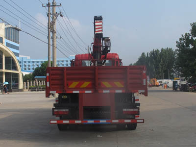 1,吊机型号/吊机自重(kg)/最大起升载荷(kg)/整备质量(kg)对应关系为: (SQ14)/5000/14000/18300;2.侧面,后下部防护装置的材料均为:Q235钢板,连接方式均为:焊接连接,后下部防护装置的断面尺寸为:100mm?0mm,离地高度为520mm;3.该车安装具有卫星定位功能的行驶记录仪;4.ABS型号:ABS/ASR-24V-4S/4M,ABS生产企业:东风电子科技股份有限公司.